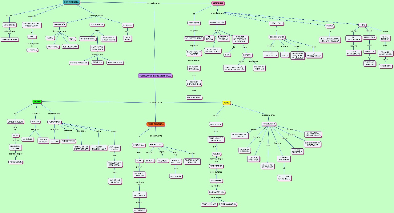 En equipo, utilizando la estrategia de trabajo colaborativo se realizo un mapa conceptual sobre el esquema de representación de las técnicas de expresión oral: conceferencia, panel, mesa redonda, foro y simposio.